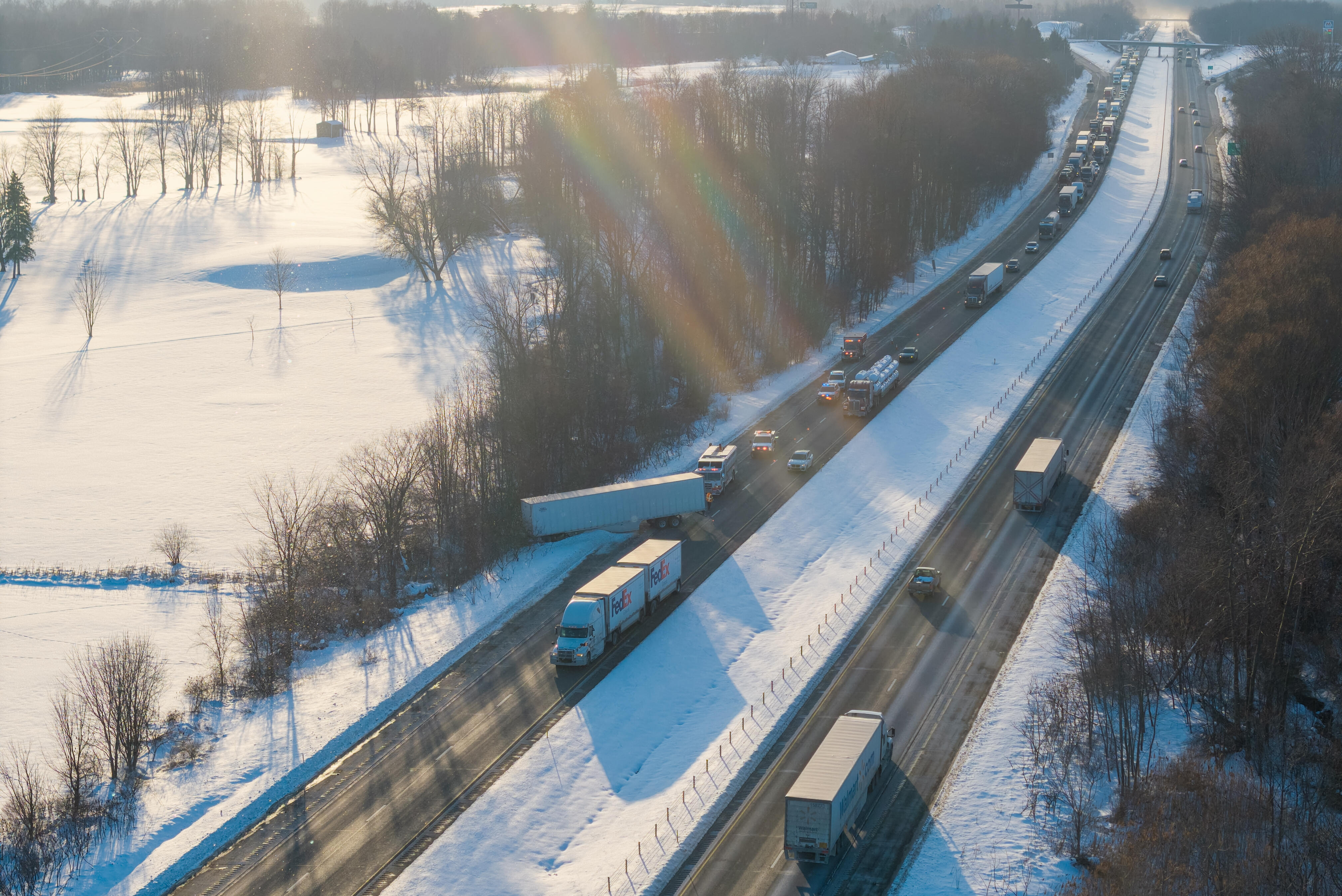 Crews arrived on scene to find one tractor trailer jackknifed off the interstate into the trees along the interstate. While crews worked on scene to contain the fluid leaks, traffic remained flowing on the interstate and traffic was pushed over to the passing lane. Once the tow trucks arrived on scene, traffic on I-90 was temporarily halted.