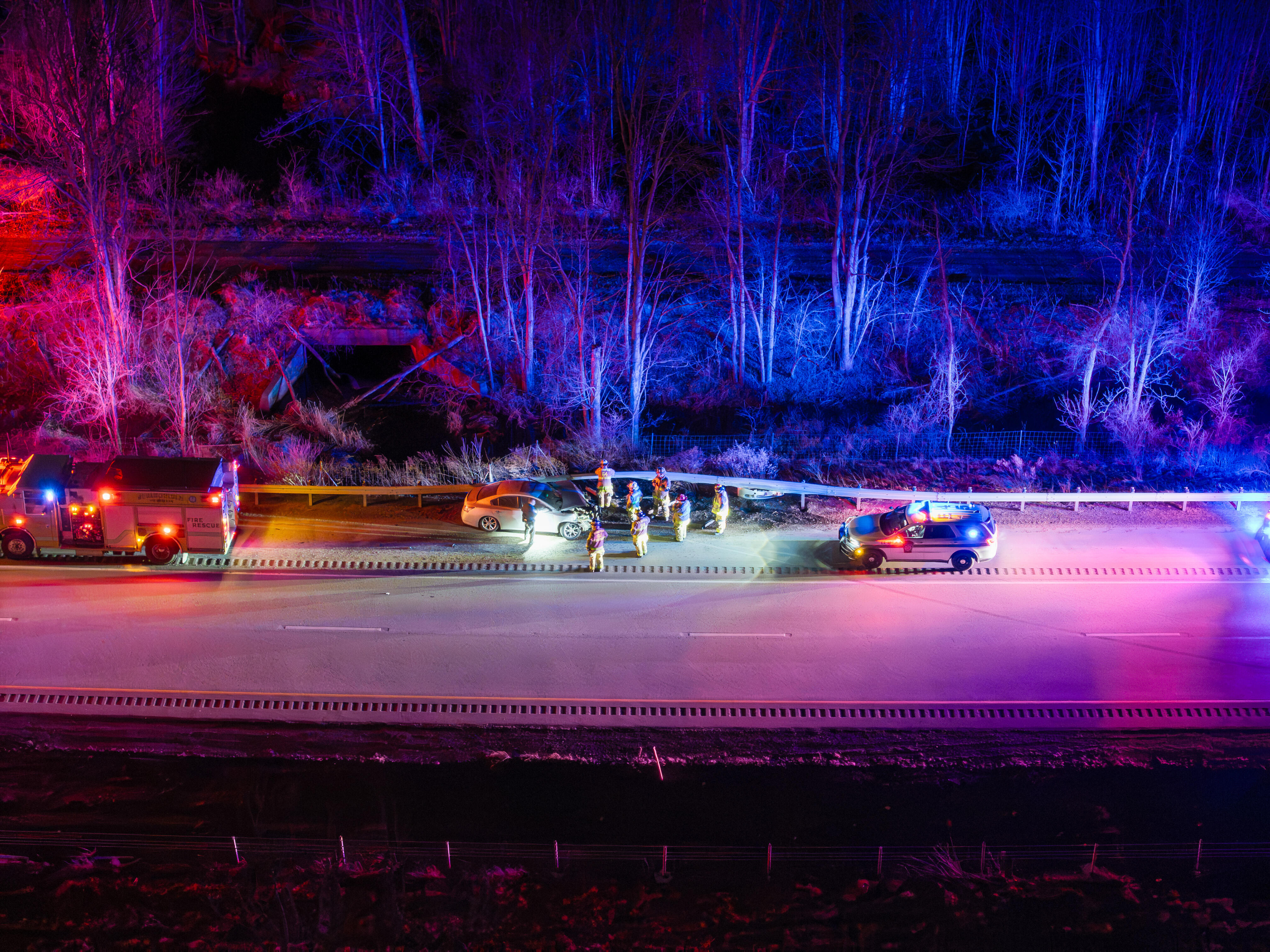 West County 110, Engine 643, and Utility 646 responded to the scene. West County 110 arrived alongside Pennsylvania State Police and reported a single vehicle with moderate damage after striking a guardrail. Springfield personnel secured the vehicle and confirmed there was no active fire.