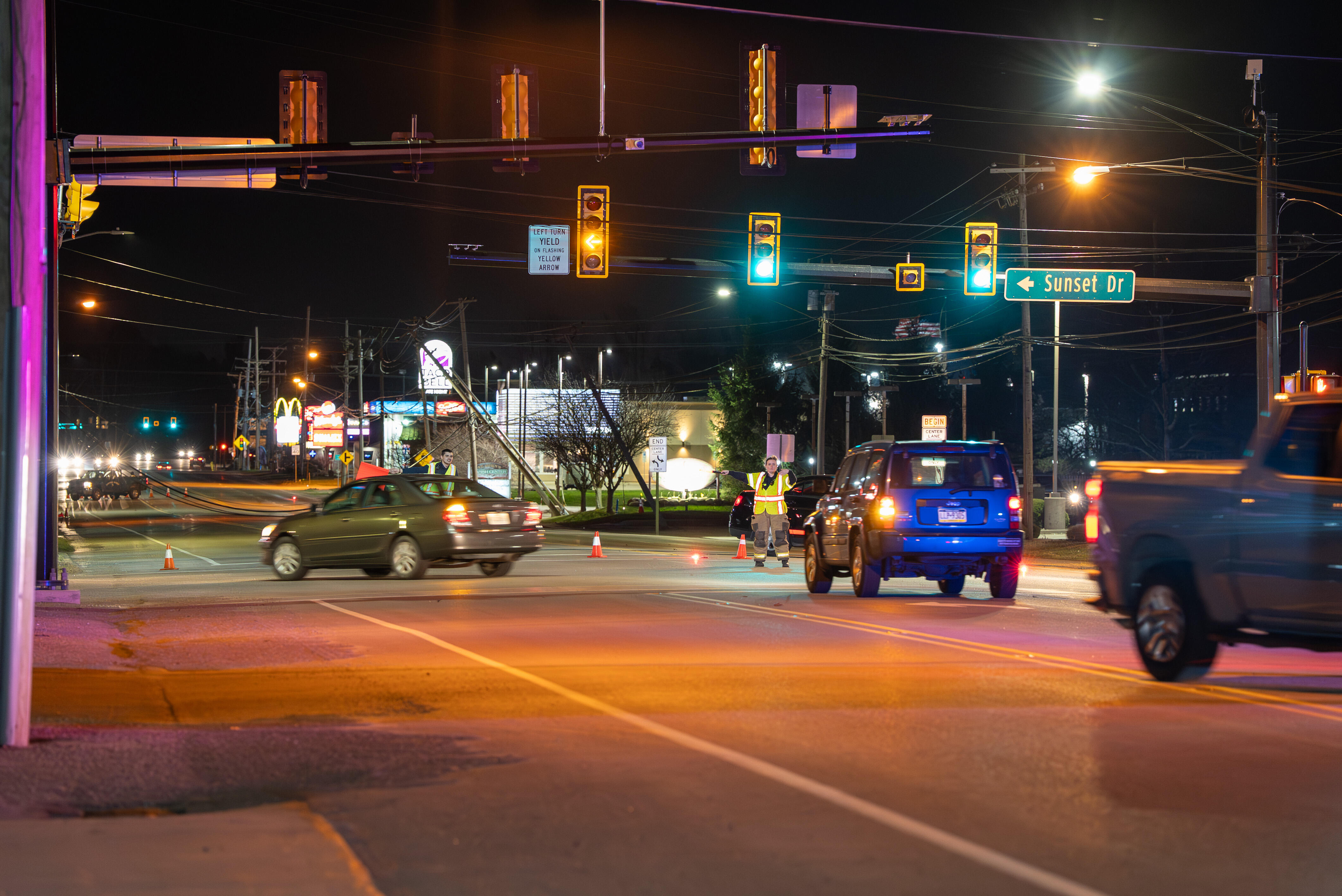 Upon arrival, crews found large strands of communication wires lying in the roadway, with a utility pole snapped at the base and being supported by the power lines above. While crews were on scene, a secondary pole snapped. Due to the roadway being impassable and the hazardous conditions present, personnel from Girard shut down East Main Street at Sunset Drive and Trinity Drive. Fire police established a detour, directing traffic down Sunset Drive and around to Trinity Drive.