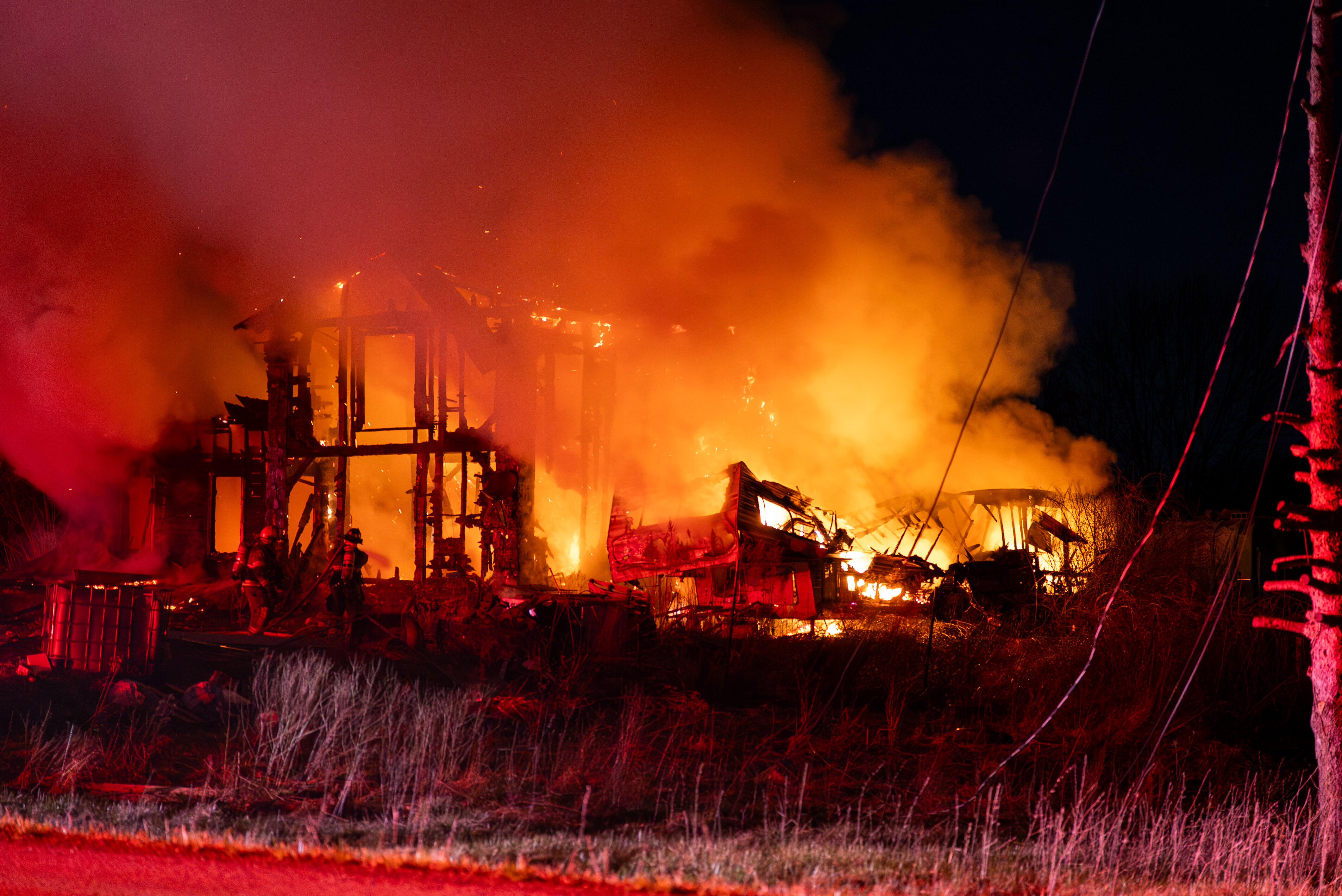 Firefighters remained on scene for several hours, working into the overnight hours to bring the fire under control and extinguish remaining hot spots. According to crews operating on scene, the structure was unoccupied at the time of the fire. No injuries were reported. The cause of the fire remains under investigation.